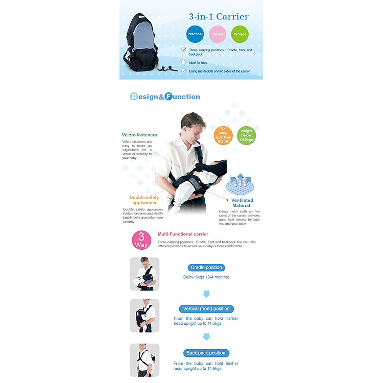 - Thiết kế đơn giản, tiện lợi: Với ba tư thế địu, mẹ có thể dễ dàng sử dụng cho bé từ khi còn nhỏ đến khi lớn hơn.