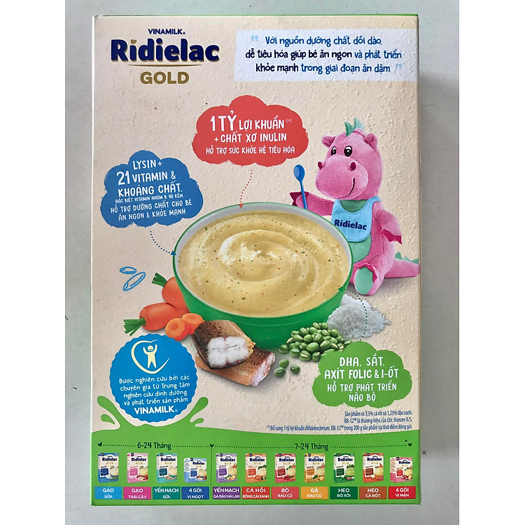 Bột ăn dặm Ridielac được nghiên cứu và phát triển dựa trên nhu cầu dinh dưỡng của trẻ nhỏ. Lươn là nguồn protein chất lượng cao, giúp trẻ phát triển thể chất và trí não. Cà rốt và đậu xanh cung cấp vitamin và khoáng chất thiết yếu, hỗ trợ hệ miễn dịch và tăng cường sức khỏe tổng thể. Với công thức đặc biệt, bột ăn dặm này đảm bảo hỗ trợ sự phát triển toàn diện của trẻ, đồng thời giúp trẻ làm quen với vị giác đa dạng.