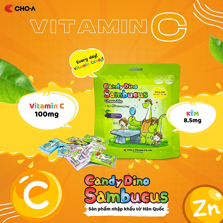- Sản phẩm: Kẹo Dino Sambucus bổ sung Kẽm và Vitamin C cho trẻ em.