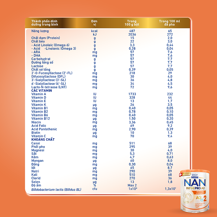 Sữa bột NAN INFINIPRO A2 không chỉ cung cấp năng lượng cho trẻ mà còn hỗ trợ phát triển não bộ, thị giác và hệ xương. Với công thức dinh dưỡng ưu việt, sản phẩm này giúp trẻ tăng cường sức đề kháng, phát triển toàn diện cả về thể chất lẫn trí tuệ. Chắc chắn rằng, đây sẽ là sự lựa chọn hoàn hảo cho các bậc phụ huynh trong hành trình nuôi dưỡng con yêu.
