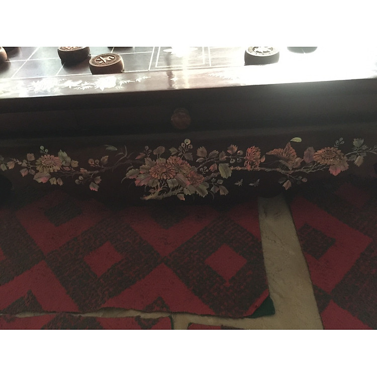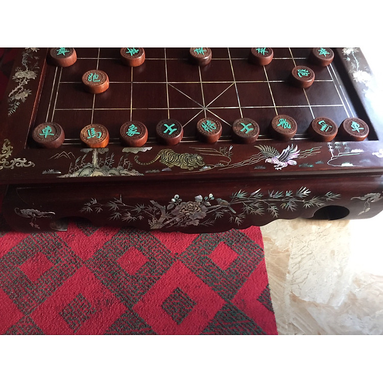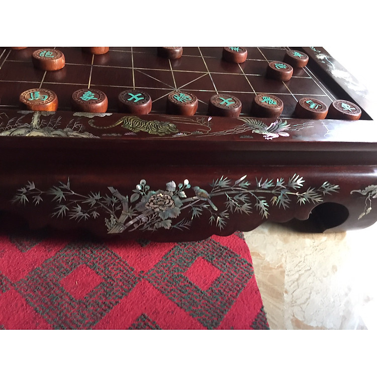 - Bàn cờ tướng làm từ gỗ gõ đỏ, khảm ốc xà cừ và vỏ bào ngư xanh đỏ.