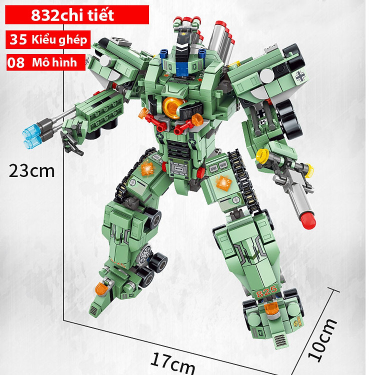 Đồ chơi lắp ráp Robot và Xe Tank 8 trong 1 được thiết kế với 832 chi tiết khác nhau, cho phép bé khám phá và sáng tạo bằng cách lắp ráp thành 25 kiểu khác nhau. Chất liệu nhựa ABS cao cấp không chỉ an toàn cho sức khỏe của bé mà còn đảm bảo độ bền cho sản phẩm. Kích thước của Robot cao 23 cm, rộng 17 cm và dài 10 cm, rất phù hợp cho những bàn tay nhỏ của các bé.